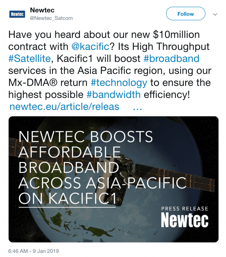 10 January 2018 – Newtec,a leader in the design, development and manufacture of equipment for satellite communications, today announced that its Newtec Dialog®VSAT multiservice platform has been selected by broadband satellite operator, Kacific, for its new High Throughput Satellite, Kacific1, to significantly expand its broadband service deliveryin underserved areas of South East Asia, New Zealand and the Pacific Islands. The initial contract is for $10million of Newtec Dialog hubs and this is expected to result in further terminal procurements totaling several million in the first years of service.
