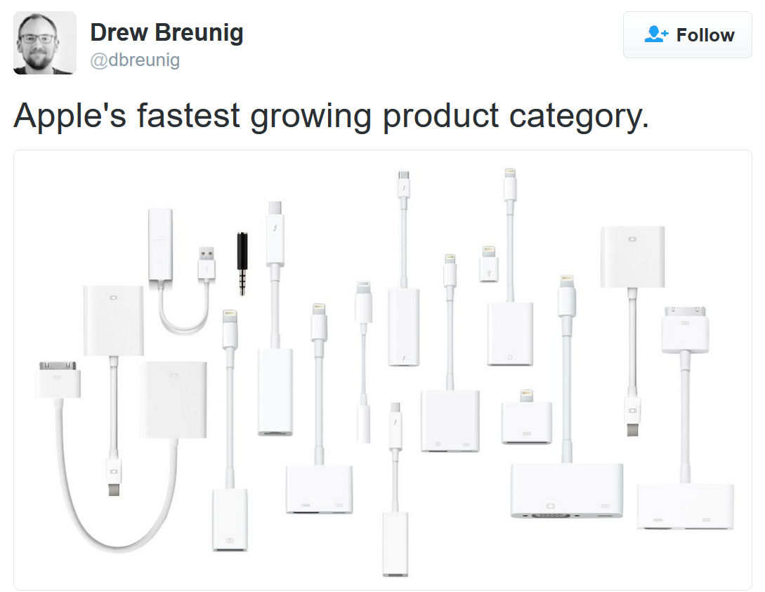 3. Apple makes an immoral business of changing the type of charger plug to connect to your device; the pre-2014 30-pin connector; the MagSafe power cable; the Lightning cable on new 2018 iPad Pro; non-standard USB ports. Can a brief moment of sales of Apple’s own cables, before the aftermarket chimes in, really outweigh the confusion they sow, the jumble of wires at our charging stations and the antipathy of their customers?