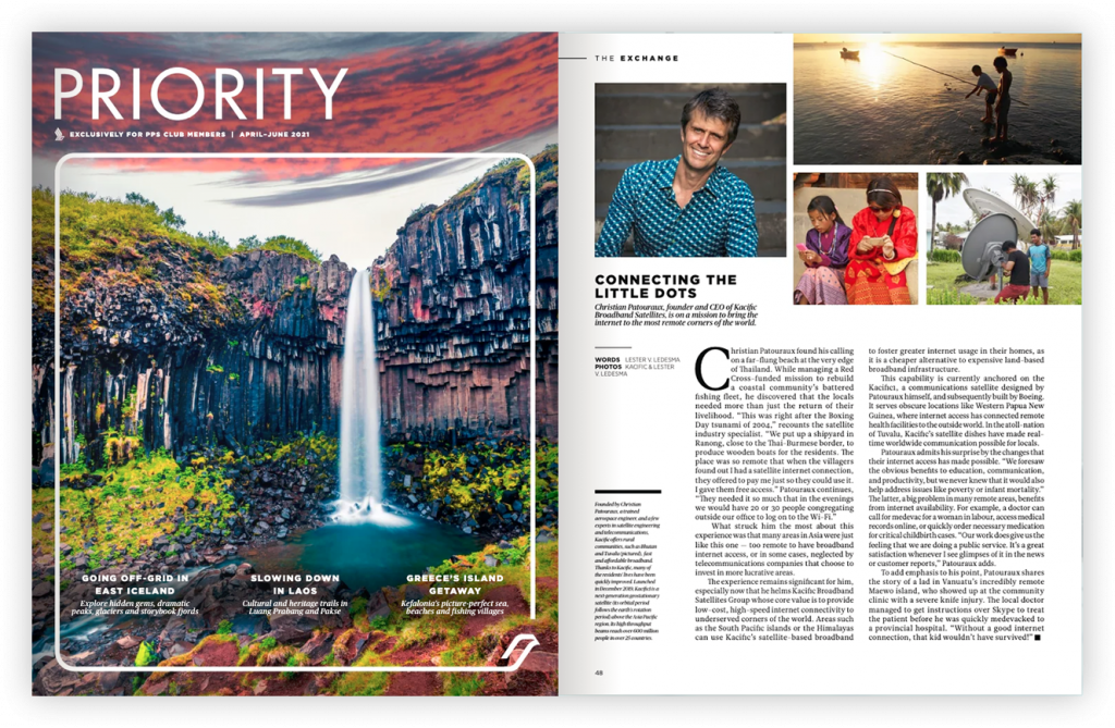 We are honoured to be featured in the latest edition of Singapore Airline’s in-flight magazine Priority Magazine! In the article, Kacific CEO Christian Patouraux speaks about improving the lives of rural communities in countries such as Bhutan and Tuvalu by offering fast and affordable broadband.
