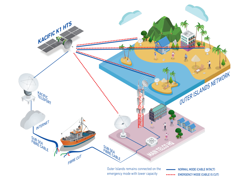 Already have a Kacific solution in place? Kacific offers Fibre Backup as a complimentary service which can be added to your Kacific network package. In the event of a fibre cut, Kacific Fibre Backup redirects your dedicated satellite bandwidth. Your remote sites continue to operate, but a small amount of capacity from each site is switched to a redundant dish at the fibre landing station. It only requires a small CAPEX to place additional dishes at fibre landing points.